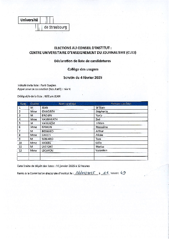 Élections étudiantes 4 février 2025 8h30 17h Des élections étudiantes partielles auront lieu le mardi 4 février au Cuej, afin de pourvoir les sièges vacances du collège usagers au Conseil d'administration du CUEJ. Une liste s'est portée candidate : le Parti cuéjien.
