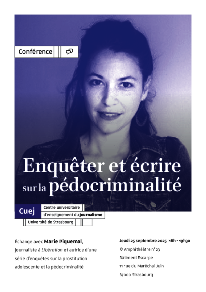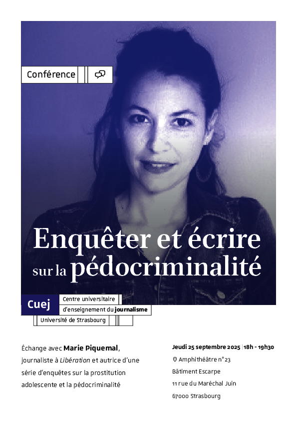 Les conférences du Cuej 25 septembre 2025 18h 19h30 Amphithéâtre n°23 Échange avec Marie Piquemal, journaliste à Libération et autrice d'une série d'enquêtes sur la prostitution adolescente et la pédocriminalité. Lieu : Amphithéâtre n°23, bâtiment Escarpe 11 rue du Maréchal Juin, 67000 Strasbourg